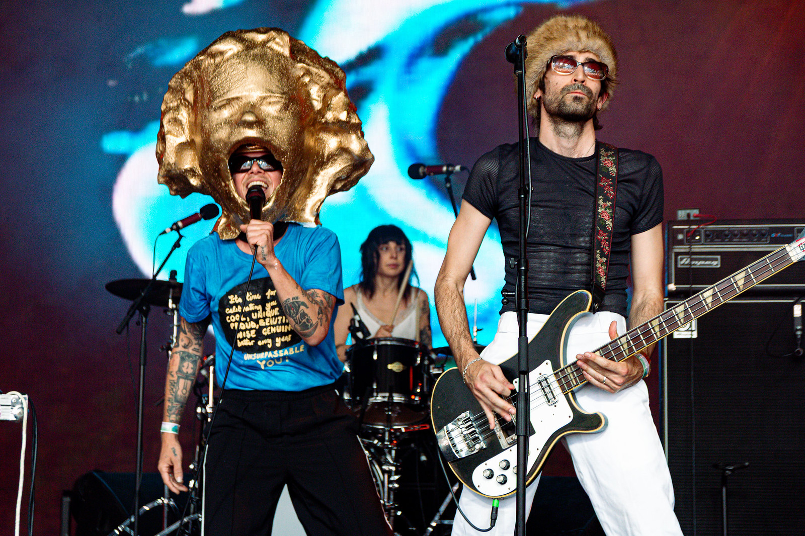 I found myself wandering around the amphitheatre, not quite sure where I was going after the Welcome, then when Dr Sure’s Unusual Practice burst onto the stage with the call of “I’m going uuuuppp” from their song Escalator Man, I knew where I was going: to the front to witness a dream come true for this band of mates. Dr Sure himself (Dougal Shaw) came out on stage wearing a massive golden papier-mâché headress – impressively this stayed on for three songs, til it got way too hot. A local favourite, there were many people stoked to see them on the stage –including most evidently themselves – as Dougal spoke of dreaming together and manifestation. As he tells the crowd towards the end: if we dream together anything is achievable, playing Meredith or abolishing the police. There’s an anti-colonial agenda that runs throughout the banter from Dougal and he takes a moment before playing recent single No Pigs to raise the voice of the voiceless for Palestine, West Papua, Sudan, Congo and all other places around the world impacted by colonial regimes.